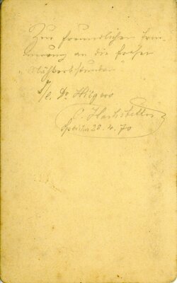 Fotografisches Brustporträt eines jungen Herren, der nach rechts aus dem Bild schaut. Er hat welliges nach hinten gekämmtes Haar.und trägt ein dunkles Sakko über einem hellen Hemd mit Fliege am Kragen.Unter dem Bild gedruckt: C. Schulz. Trier, Dietrichstr. 216 Auf der findet sich ein noch zu entziffernder Text.