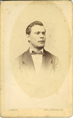 Fotografisches Brustporträt eines jungen Herren, der nach rechts aus dem Bild schaut. Er hat welliges nach hinten gekämmtes Haar.und trägt ein dunkles Sakko über einem hellen Hemd mit Fliege am Kragen.Unter dem Bild gedruckt: C. Schulz. Trier, Dietrichstr. 216 Auf der findet sich ein noch zu entziffernder Text.