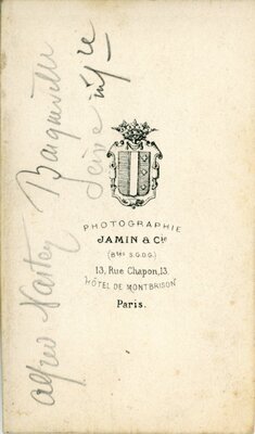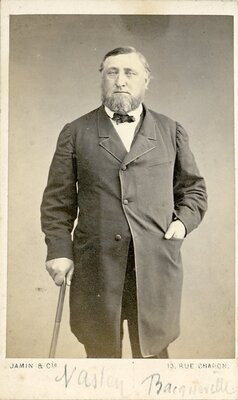 Fotografie eines stehenden Herren mittleren Alters in dunklen Gehrock und hellem Hemd mit Fliege am Kragen. Er stützt sich mit seiner linken Hand auf einen Stock, seine Rechte steckt zur Hälfte in der Rocktasche. Er hat ein kräftiges Gesicht mit müden Augen und trägt einen krausen Vollbart. Ersteht frontal zum Betrachter und blickt ihn direkt an. Unter dem Bild mit Bleistift Nasten Baquevelle Gedruckt ein Wappen mit Krone Photographie JAMIN & CIe13, rue Chapon 13 Hotel de Montbrison Paris