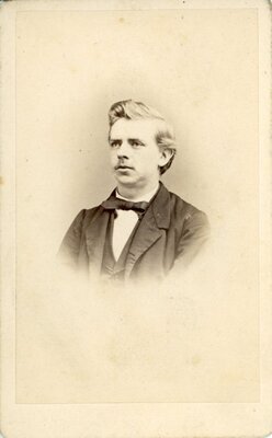 Fotografie eines bartlosen Herren mit hellen glatten Haaren, die vom Seitenscheitel nach rechts zu einer Tolle hoch gekämmt wurden. Er trägt eine dunkle Weste und Jacke und ein helles Hemd mit Fliege am Kragen. Er schaut nach links aus dem Bild. Auf der Rückseite: mit Tinte geschrieben, Aug Caspers s/m l. L. Hilgers Berlin 1.3. 186? Gedruckt: Wappen mit Krone Leopold Wallnau Berlin 9, Neue Wilhelmstr. 9 nahe den Linden