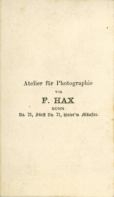 Porträtfotografie eines Jungen Herren in dunkler Jacke und Weste über einem hellen Hemd mit dunkler Fliege am Kragen. Er ist bartlos, hat hellere, glatte nach hinten gekämmte halblange Haare. Er blickt den Betrachter frontal an, ein bisschen sieht er durch ihn hindurch. Unter dem Bild mit Tinte: S. Schumacher s/m L. Hilgers z. f. E. 1865 Auf der Rückseite gedruckt: Atelier für Photographie von F. HAX Bonn No. 71, Sürst no.71, hinter´m Münster