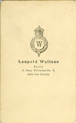 Fotografisches Brustporträt eines Herren in dunkler Jacke und hellem Hemd mit Fliege am Kragen. Er trägt einen sehr gepflegten kurzen Vollbart, der an der Oberlippe in zwei kleine Spitzen gezwirbelt ist. Seine glatten, linksgescheitelten, mittelhellen Haare sind ordentlich zur Seite gekämmt. Er blickt nach links aus dem Bild. Im Bild mit Bleistift geschrieben: Schlecht lesbar, Dr. Hilgres z. fr. er. 1867 Unter dem bild gedruckt: Leopold Wallnau Berlin Auf der Rückseite: Wappen mit Krone Leopold Wallnau Berlin 9, Neue Wilhelmstr. 9 nahe den Linden
