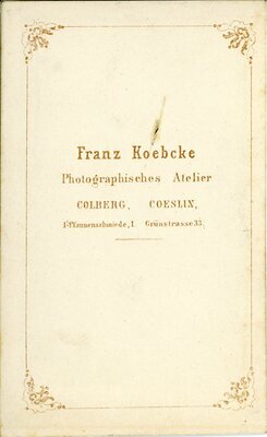 Porträtfotografie, in dreiviertel Ansicht, eines jungen Herren in zugeknöpfter dunkler Jacke und gemusterten Halstuch unter den hellen Hemdkragen. Er hat einen leichten Oberlippenbart, seine dunklen, welligen, halblangen Haare sind in der Mitte gescheitelt und zur Seite gekämmt. Sein Gesicht ist schmal und er blickt mit hellen Augen nach rechts aus dem Bild. In das Bild mit Tinte geschrieben: DrSchönke s/m DrHilgers z. fr. Er. Colberg. Septemb. 1866 Unter dem Bild gedruckt: Photogr.v. Franz Koebcke Auf der Rückseite: Franz Koebcke Photographisches Atelier Colberg Coeslin
