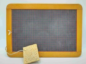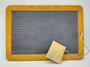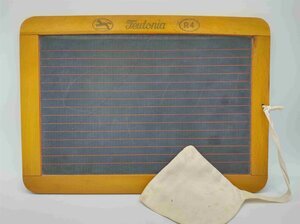 Die Schiefertafel besteht aus einer Schieferplatte, die von einem Holzrahmen eingefasst ist. In die Schiefertafel ist auf der einen Seite ein kariertes Muster und auf der anderen Seite einfache Linien eingeritzt, so dass auf der einen Seite die Matheaufgaben und auf der anderen Seite die übrigen Aufgaben in der Schule bearbeitet werden konnten. Am Holzrahmen ist ein kleines Schwämmchen an einer Schnur befestigt, in welchem zu diesem Zweck ein kleines Loch gebohrt ist. Der Holzrahmen ist zusammengesteckt und geleimt und auf der Seite mit der linierten Einritzung ist die Prägung des Herstellers vorhanden: Teutonia. Links vom Schriftzug ist vermutlich das Logo von Teutonia eingeprägt, ein Pferd, und Rechts ist die Angabe der Lineatur eingeprägt: R4.