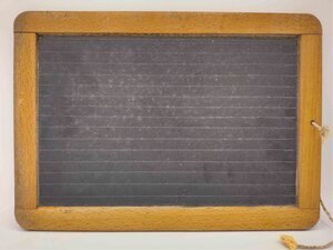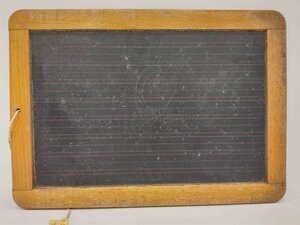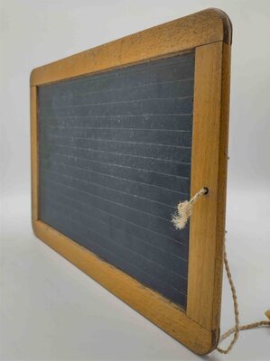 Die Schiefertafel besteht aus einer Schieferplatte, die von einem Holzrahmen eingefasst ist. Auf der einen Seite der Tafel findet sich eine Linierung mit einem Abstand von 4mm, dazwischen ist ein Freiraum von 8mm. Auf der anderen Seite finden sich einfache Linien ohne die weitere Hilfslinie. Somit ist die Tafel vor allem für Schreibübungen geeignet. In den Holzrahmen ist ein kleines Loch gebohrt, damit an ihm auch ein Läppchen oder Schwämmchen befestigt werden kann. Bei dieser Tafel ist lediglich noch die Schnur vorhanden, an der einmal ein Schwämmchen befestigt war, Reste des Schwämmchens sind noch am Ende der Schnur verknotet. Der Holzrahmen ist zusammengesteckt und geleimt, es finden sich keinerlei Prägungen eines Herstellers.
