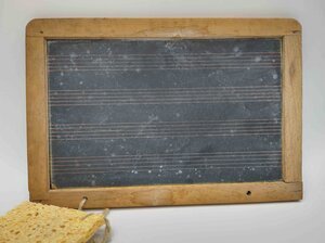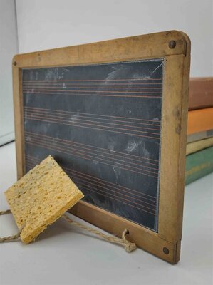 Schiefertafel mit Notenlinien und Schwämmchen
