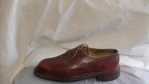 Ein Einzelner Schwarzer Herren-Halbschuh aus Leder. Runde Form, Schuhgröße 7,5. Der Schuh hat einen Blockabsatz von 3cm und einen Plateau von 1 cm. Er verfügt über eine Schnürung ohne Ösen und ohne Schnürsenkel, zudem über Ziernähte und Zierlochungen.