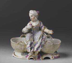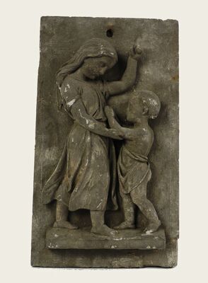 Allegorisch, illustrierendes Pastellgemälde des aus Rhodt unter Rietburg stammenden Malers Johann Jabob Serr inspiriert von dem Gedicht von Friedrich Schiller °Das Mädchen aus der Fremde°. Zentrale Figur des Gemäldes ist die Gestalt einer jungen, blonden Frau in weißem Kleid. In dem zur Schürze hochgebundenen Kleid trägt sie einige Früchte. Die rechte Hand hält einen Blumenkranz, den sie einer herbeieilenden jungen Frau aufzusetzen im Begriff ist. Diese junge Frau wird von einem jungen Mann begleitet. Beide fassen sich an den Händen. Das Mädchen im weißen Kleid trägt auf dem Kopf einen Lorbeerkranz, sie ist die zentrale Figur des Bildes, im Hintergrund eingerahmt durch eine sich ins Weite öffnende Landschaft. Links nimmt man ein Gebäude war, rechts einen spärlich bewachsenen Hang. Neben dem unmittelbar links neben dem Mädchen herangetretenen Paar befinden sich links vier und rechts fünf weitere Personen. Vom Säugling bis zum Greis sind alle Lebensalter vertreten. Bis auf das Mädchen im weißen, zeitlosen Gewand entspricht die Kleidung der anderen Figuren am ehesten einem ländlich biedermeierlichen Kleidungsstil. / Schillers Gedicht, das Serr hier malerisch paraphrasiert, handelt von einem jedes Jahr wiederkehrenden, geheimnisvollen Mädchen, das ein Tal armer Hirten besucht. Diesen brachte sie Blumen und Früchte, °ein jeder ging beschenkt nach Haus°. Besonders bedacht wurden von ihr aber die Liebenden: °Willkommen waren alle Gäste; Doch nahte sich ein liebend Paar, Dem reichte sie der Gaben beste, Der Blumen allerschönste dar.° Möglicherweise handelt es sich hier um ein Frühwerk Serrs aus seiner Zeit an der Münchner Akademie. Serr, der im Wesentlichen als Porträtist seinen Lebensunterhalt verdient, mag in der Münchner Zeit am ehesten zu solch größeren Bildthemen angeregt worden sein.