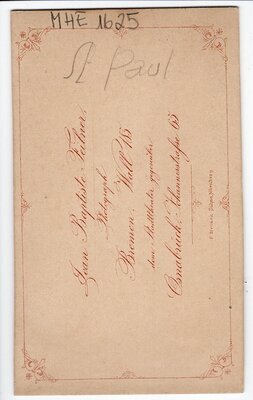 Das Mädchen steht hinter einem Stuhl, ein Arm auf dem Stuhl abgelegt. Sie trägt ein dunkles, 2-teiliges Kostüm, mit weißen Rüschen am Kragen und an den Ärmeln. Das Revers sowie die Ärmelenden sind gestreift. Um den Hals trägt sie eine weiße Perlenkette, die Ohren sind mit kleinen Ohrringen geschmückt. Ihr Haar ist gescheitelt und nach hinten gekämmt und mit einer Blume verziert. Die Rückseite wurde für Eigenwerbung genutzt und enthält den vollständigen Namen und Adresse des Photografen. Die Studioaufnahme ist vom Fotograf Jean Baptiste Feilner aus Osnabrück.