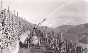 Zu sehen ist ein Gerät, mit dem im Weinberg Flüssigleiten, wie z. B. Anti-Schädlingsmittel, gespritzt werden konnten. Das Gerät wurde hierzu im Boden mittels Stützen arretiert. Durch den Überdruck ergießt sich die Flüssigkeit aus dem Rohr. Das Foto stammt aus der ehemaligen Landes-Lehr- und Versuchsanstalt (LLVA) in Bernkastel Kues.