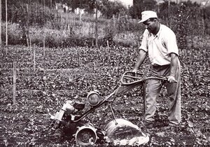 Zu sehen ist ein Mann, der in einer Rebschule mit einer motorgetriebenen Fräse arbeitet. Das Foto stammt aus der ehemaligen Landes-Lehr- und Versuchsanstalt (LLVA) in Bernkastel Kues.