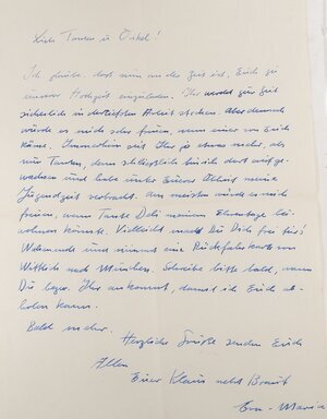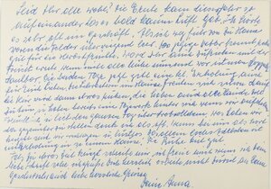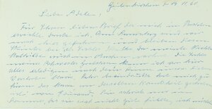 Ein Brief an die Geschwister Stolz aus Großlittgen bei Wittlich in der Eifel. Der Brief wurde am 8. Januar 1960 versendet. Er befindet sich noch in dem dazugehörigen Umschlag. Abgeschickt wurde der Brief aus Höchenschwand im Schwarzwald. In dem Schreiben bedankt er sich für die Neujahrsgrüße. Daneben berichtete er von kürzlichen Erlebnissen und seinem derzeitigen Leben. Außerdem erkundigt er sich nach den Geschwistern und grüßt diese.