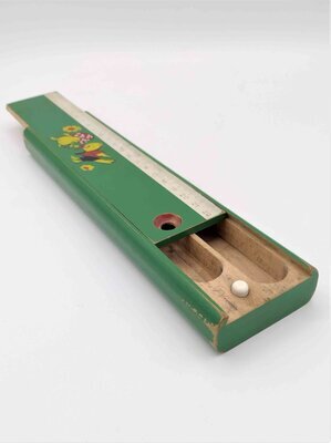 Die Griffeldose, auch als Griffelkasten bekannt, ist aus Holz gefertigt, außen grün lackiert und mit einem Entenmotiv versehen. Der Deckel der Dose kann zu beiden Seiten herausgeschoben werden, dafür muss nur der weiße Knopf heruntergedrückt werden. Er verhindert, dass die Dose sich von alleine öffnet. Auf den Deckel ist das Wort "KLICK" eingeprägt, vermutlich als Hinweis, dass der Deckel erst "Klick" machen muss, damit er richtig geschlossen ist. Der Deckel der Dose kann des Weiteren als Lineal verwendet werden. Innen ist die Dose in drei Fächer aufgeteilt, ein großes, ein mittleres und ein kleines Fach. Dort konnten Griffel, Federhalter, Stifte und andere Schreibutensilien aufbewahrt werden. Die Griffeldose besitzt keinerlei Prägung, die einen Hinweis auf den Hersteller gibt. Auf der Unterseite ist lediglich Folgendes eingeprägt: "B. Patent Nr. 814268, Cohr. Muster 1628568" (Bei diesen Angaben handelt es sich um das, was gerade so erkennbar ist, die Angaben können jedoch auch aufgrund der schlechten Erkennbarkeit falsch sein.)