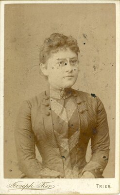 Sehr verschmutztes Brustporträt einer jungen Dame. Sie trägt ein enges Kleid mit enger dunkler Jacke darüber. Sie hat eine aufallend schmale Taille. Sie trägt eine bügellose Brille, ihre Haare sind dicht an den Kopf frisiert. Sie blickt rechts am Betrachter vorbei aus dem Bild. Unter dem Bild: Joseph Fier Trier Auf der Rückseite: Joseph Fier 31Fleischstr.31 Trier 1888