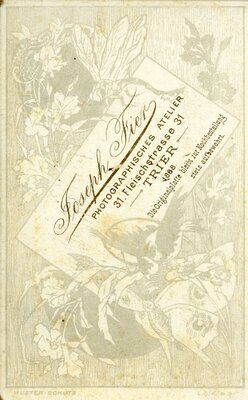 Sehr verschmutztes Brustporträt einer jungen Dame. Sie trägt ein enges Kleid mit enger dunkler Jacke darüber. Sie hat eine aufallend schmale Taille. Sie trägt eine bügellose Brille, ihre Haare sind dicht an den Kopf frisiert. Sie blickt rechts am Betrachter vorbei aus dem Bild. Unter dem Bild: Joseph Fier Trier Auf der Rückseite: Joseph Fier 31Fleischstr.31 Trier 1888
