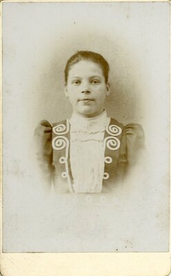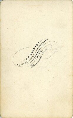 Kleines fotografisches Brustporträt einer jungen Dame mit dunklen, nach hinten frisierten Haaren. Sie trägt ein helles Kleidungsstück mit einer schräg geschnittenen Knopflieste, die in einer Bordüre liegt. Eine dunkle Kette mit Brosche verziert ihren Kragen. Ihr Gesicht ist leicht nach links gewendet, sie blickt aber direkt in die Kamera. Auf der Rückseite: J.P. Schmidt Trier Kupferstecher u. Photograph Pferdemarkt No. 334