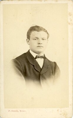 Brustporträt-Fotografie eines jungen Herren, bartlos und mit ordendlich frisiertem kurzen Haar. Er trägt eine dunkle Jacke, ein helles mit dunkler Fliege am Kragen. Er blick direkt in die Kamera. Unter dem Bild: P. Streit Trier Die Rückseite ist leer.