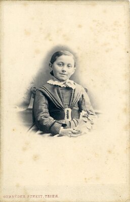 Porträtfotografie eines Mädchens in dunklem Kleid, aus mit hellen Karos überzogenen Stoff. Um den Bauch trägt sie einen breiten Gürtel mit einer senkrechten großen Schnalle, unter der sie ihre Hände zusammen legt. Ihren Kopf mit straff frisiertem Haar hat sie leicht nach links geneigt und blickt den Betrachter etwas skeptisch an. Unter dem Bild: Gebrüder Streit, Trier Auf der Rückseite: Atelier von Gebrüder Streit Zuckerbergstraße Trier