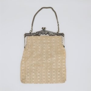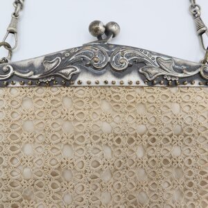 Die cremefarbene Handtasche ist aus Occhi-Spitze gefertigt und mit gleichfarbigem Seidentaft gefüttert. Die ornamentale Metalleinfassung ist an der unteren Kante daran befestigt, die Naht ist mit aufgestickten Perlen dekoriert. Das geschwungenes Relief befindet sich nur auf der Vorderseite, hinten ist das Metall schlicht gehalten. Eine abnehmbare Kette dient zum Tragen der Handtasche.