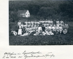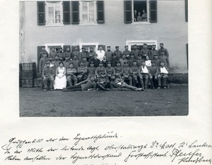 Das Foto zeigt verwundete Soldaten sowie einige Zivilpersonen aus dem Rotkreuzlazarett der pfälzischen Gemeinde Kindsbach beim Besuch des Niederwalddenkmals in Rüdesheim im Rheingau. Links unten auf dem weißen Rand des Fotos Ovalstempel mit umlaufender Schrift: "BAYER. VEREINS-LAZARETT". Unterhalb des mittig gesetzten Rotkreuzzeichens die Ortsangabe "KINDSBACH". Transkription des handschriftlichen Eintrags auf der rechten Seite des Fotos: "Die Verwundeten des Vereinslazaretts Kindsbach am Niederwalddenkmal unter der Führung des Lazarett- vorstandes Pfeufer. - Siegesfeier Eroberung Warschaus -. K. 6.10.15 Pfeufer" (Dank an Herrn Gernot Maurer aus Kindsbach für freundliche Hinweise zur Transkription.)