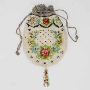Bei diesem Beutel handelt es sich um einen sogenannten Pompadourbeutel, eine Art Beutel die im Laufe des 18. Jahrhunderts und Anfang des 20. Jahrhunderts in Gebrauch waren. Dieses Exemplar ist überwiegend mit beigen Perlen verziert, dazwischen sind Organge-, Blau- und Violetttöne in Form von Blumen eingearbeitet. Der Beutel ist innen mit feinem Stoff in creme gefüttert. Den Verschluss bilden die rund um den oberen Rand herum angebrachten umhäkelten Ringe, durch die eine Kordel gezogen ist.