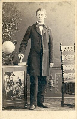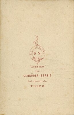 Abbildung eines stehenden jungendlichen Herren in dunklen Mantel und Hosen und hellem Hemd mit großer dunkler Fliege am Kragen. Er ist bartlos, hat das mitellange Haar zur Seite gekämmt und blickt nach Links aus dem Bild. Er steht zwischen einer Kommode und einem aufwändig geschnitzten Stuhl. Seine rechte Hand hält ein Buch mit dem er sich auf einem weitern Buch abstützt. Links neben ihm ist ein Globus zusehen. Auf der Rückseite: rot gedruckt, Atelier von Gebrüder Streit Zuckerbergstraße Trier