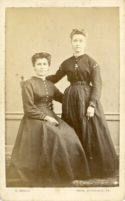 Fotografie zweier Damen, links sitzend, rechts stehend. Die sitzende ist die selbe Person wie die vorher gehende. Sie tragen beide bodenlange dunkle Kleider, die von der Taille bis zum Hals zu geknöpft sind. Beide schauen direkt in die Kamera. Unter dem Bild: C. Schulz Trier, Dietrichstraße 216 Die Rückseite ist leer.