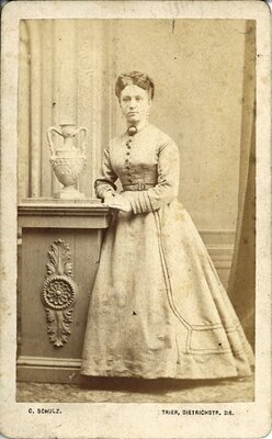 Porträtfotografie einer stehenden Dame in hellem, hochgeschlossenem , bodenlangen Kleid. Sie steht neben einem Postament auf dem ihre Hände ruhen. Sie ist akkurat frisiert, steht aufrecht und blickt gerade in die Kamera. Am ihrem Kragen sieht man eine große, runde Brosche. Unter dem Bild: C. Schulz Trier, Dietrichstraße 216 Die Rückseite ist leer.