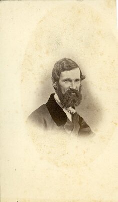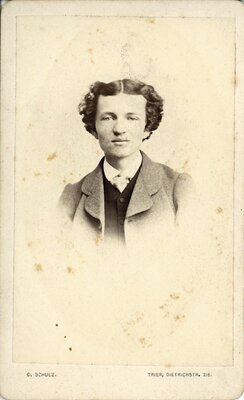Frontalporträt eines jungen Mannes in mittel heller, geöffneter Jacke, dunkler Weste und sehr hellem Hemd mit hellem Halstuch. Er hat schmale Schultern, ist bartlos und hat die dunklen, welligen mittellangen Haare zur Seite gekämmt. Er macht einen legeren Eindruck und blickt ganz leicht von oben in die Kamera. Unter dem Bild: C. Schulz Trier, Dietrichstraße 216 Die Rückseite ist leer.