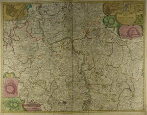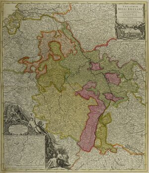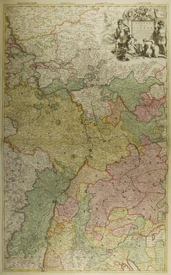 Die Karte zeigt die Gebiete entlang des Oberrheins von Basel bis Mannheim und wird von insgesamt neun Festungsplänen flankiert. Es handelt sich um strategisch wichtige Festungen, die - abgesehen von Mannheim - alle vom Marschall von Frankreich und Festungsbaumeister Ludwigs XIV. Sébastien Le Prestre de Vauban errichtet, um- oder ausgebaut wurden. Zwischen 1665 und 1707 schuf Vauban ein durch zahlreiche Festungen gesichertes Verteidigungsnetz zum Schutz der französischen Grenze, den so genannten "Eisernen Gürtel" ("ceinture de fer"). Der Kartentitel "Theatrum Belli" bzw. "Kriegstheater" ist ein Begriff, der sich in der Frühen Neuzeit für Kriegsschauplätze oder -gebiete etabliert hat. Thematisch passend ist die Titelkartusche mit Kriegstrophäen verziert. Der Westen des Reiches, insbesondere die Rheingegend war vom späten 16. Jh. bis ins frühe 18. Jh. nahezu pausenlos Schauplatz von Kriegen. 1734 war die Rheingegend einer der Hauptschauplätze während des Polnischen Thronfolgekrieges. Die Karte wurde von den Erben von Johann Baptist Homann (1664-1724) angefertigt. Homann war Kartograf, Kupferstecher, Hersteller von Globen und der bedeutendste Herausgeber von Karten und Atlanten im deutschen Gebiet des 18. Jh. Nach seinem Tod 1724 führte zunächst sein Sohn Johann Christoph das Unternehmen weiter. Nach dessen Tod 1730 wurde das Geschäft unter dem Namen "Homanns Erben" bis Mitte des 18. Jh. weitergeführt. [Johanna Kätzel]