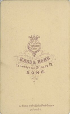 Fotografie einer stehenden Dame und eines sitzenden Herren. Sie steht hinter seinem Stuhl, beide schauen direkt in die Kamera. Sie trägt ein helles bodenlanges Kleid, ihre rechte Hand ruht auf der Stuhllehne, die Linke hängt frei vor ihrem Rock. Er sitzt in dunklen Anzug mit Gehrock und hellen Hemd an einem Tisch, auf den er seinen rechten Arm stützt. Auf dem Tisch liegt sein Zylinder. Seine linke Hand liegt auf seinem Oberschenkel. Unter dem Bild: Hess & Hohe Bonn Auf der Rückseite: Hess & Hohe 12 Coblenzer Strasse 12 BONN