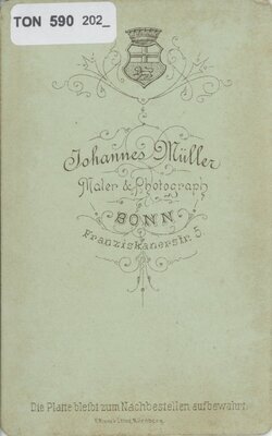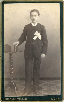 Fotografie eines stehenden Jungen an einem einbeinigen Konsoltisch mit spiralig gedrechseltem Bein. Auf dem Tisch liegt seine Mütze und ein kleines Buch, auf das er sich stützt.Er trägt einen dunklen Anzug mit weißem Hemd und einer großen Schleife auf der Brust, mit einer weißen Blume. Er ist sehr ordentlich gekämmt und sieht etwas erschrocken in die Kamera. Vermutlich handelt es sich um ein Konfirmationsbild. Die Karte ist schwarzgrundig mit Goldrand. Unter dem Bild: Johannes Müller Bonn Auf der Rückseite: Johannes Müller Maler & Photograph Franziskanerstr. 5