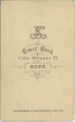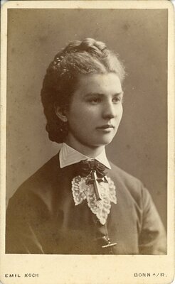 Porträtfoto einer jungen Dame in dreiviertel Ansicht mit Blick nach rechts aus dem Bild. Ihre krausen Haare sind sehr akkurat mit Mittelscheitel zu den Seiten frisiert. Sie trägt ein dunkles Oberteil mit einem sehr hellen Kragen unter dem ein Kreuz hängt, das auf einer weißen Spitzenjabot liegt. Unter dem Bild: Emil Koch Bonn a/R Auf der Rückseite: Emil Koch Cöln Strasse 23 Bonn