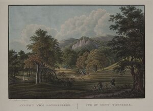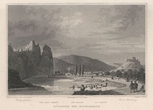 Eine kolorierte Radierung eines idyllisch am Fluss gelegenen Dorfes. Es ist das sechste Blatt aus der sechs Blätter umfassenden Serie „Bingen, Creuznach, das Nahthal und der Donnersberg“. Unterhalb der Radierung wird das Motiv auf Deutsch und Französisch benannt: „Das Dorf Ebernburg/ Le village d‘Ebernburg“. Die Künstler sind je links und rechts unterhalb der Radierung vermerkt: „E. Fries del.“ und „L. Hess gest.“. Gezeichnet wurde das Motiv von dem deutschen Landschaftsmaler Ernst Fries und gestochen von dem Schweizer Landschaftsmaler und Kupferstecher Ludwig Hess. Farblich ist sie in Grün-, Blau- und Brauntönen gehalten. Rechts in der Grafik sind einige Fachwerkhäuser abgebildet. Aus einem Haustor treibt ein Mann mit erhobenem Stock zwei Rinder hinaus. Vor den Fachwerkhäusern sind vereinzelte Bäume und eine Frau im Kleid steht neben einem Rind. Links in der Radierung ist ein Fluss, die Nahe, auf dem drei Männer in einem kleinen Boot fischen. Oberhalb dieser Männer ist eine Mühle. Im Hintergrund erheben sich die Felsenmassive des Nordpfälzer Berglandes. Rechts oberhalb des Dorfes sind die Ruinen der Ebernburg abgebildet. 1969 wurden Ebernburg und die Gemeinde Bad Münster zusammengeführt. Bad Münster am Stein-Ebernburg ist ein Stadtteil von Bad Kreuznach in Rheinland-Pfalz. [Kathrin Koch]