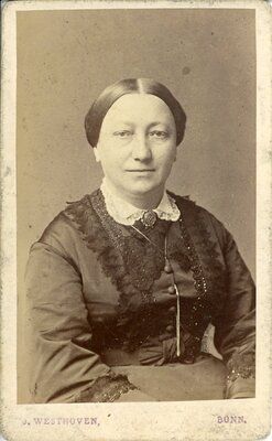 Porträtfotografie einenr sitzenden Dame in dunklen Kleid, oder Bluse mit Spitzenbesatz. Sie hat glatte in der Mitte gescheitelte Haare, die engst anliegend zur Seite gekämmt sind. Sie hat ein ruhiges offenes Gesicht und blickt gelassen in die Kamera. Unter dem Bild: J. Westhoven Bonn Auf der Rückseite: kaum lesbar: J Westhoven Bonn