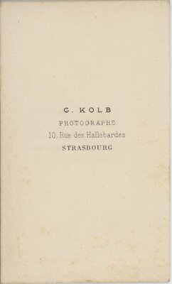 Das Foto zeigt eine, hinter einem Stuhl, stehende Dame in einem bodenlangen dunklen Kleid. Sie hat ihren Seitenscheitel links, die Haare sind nach Hinten und zur Seite gekämmt. Sie schaut etwas verloren knapp am Betrachter vorbei. Auf der Rückseite: C. Kolb Photographe 10. Rue des Hellebardes Strasbourg