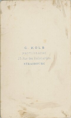 Fotografische Abbildung zweier Herren in einem Fotostudio. Der eine sitzt links auf einem Stuhl, der andere steht rechts daneben, sein rechter Arm liegt auf der Schulter des Sitzenden, mit der Rechten hält er einen flachen Strohhut. Beide tragen mitteldunkle, Mäntel und Anzüge. Ihre halblangen dunklen Haare sind zur Seite gekämmt. Sie blicken gerade in die Kamera. Unter dem Bild: G. Kolb Phot. Auf der Rückseite: G. Kolb Photooraphe 10. Rue des Hellebardes Strasbourg
