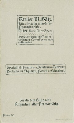 Portrait einer stehenden, sich auf eine Stuhllehne aufstützenden Dame mit voluminöser, hochgesteckter Duttfrisur, im dunklen Kleid mit Rüschenbesatz an Brust und Kragen. Sie blickt direkt in die Kamera. Unter dem Bild: Atelier Bätz Nord Allee 53 Trier. Auf der Rückseite: Atelier M. Bätz künstlerische u. moderne Photographie. Trier Nord Allee 53 part. Spezialität: Familien u. Jubiläums Tableaux, Portraits in Aquarell,- Pastell u. Oelmalerei. Zu diesem Bilde sind Rähmchen aller Art vorrätig.