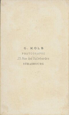 Abbildung eines stehenden Herren mit Oberlippenbart, nach hinten gekämmten Haaren und etwas mürrischen Gesicht. Er steht hinter einem stark geschnitzten Neorenaissancestuhl und trägt eine helle Hose und Weste unter einem dunklen Gehrock. Er schaut direkt in die Kamera. Unter dem Bild: G. Kolb, Phot. Auf der Rückseite: G. Kolb Photooraphe 10. Rue des Hellebardes Strasbourg