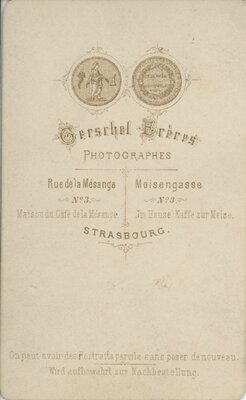 Auf dem Foto ist eine ältere sitzende Dame zu sehen. Sie trägt ein dunkles Kleid mit weitem Rock. Sie sitzt auf einem stark geschnitzten Stuhl, hat ihren linken Arm auf den Rock gelegt, der Rechte ruht auf einem Tisch mit Decke. Auf dem Kleid sieht man eine lange helle Kette. Unter einer Haube mit langen plissierten Bändern sieht man ihre glatten hellen Haare. Sie blickt ein bisschen von oben auf die Kamera herab. Auf der Rückseite: Gerschel Freres Photographes Rue de la Mesange N.3 Meisengasse N.3 Strasbourg