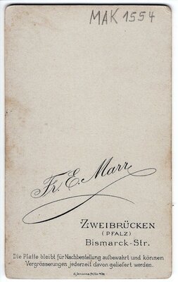 Die Vignettierte Aufnahme zeigt das Brustbild einer jungen Frau. Sie trägt ein dunkles Oberteil mit Stehkragen, an dem eine Brosche befestigt ist. Als weiteren Schmuck trägt sie kleine Ohrringe. Das Oberteil der Bluse, hat in Falten gelegte Puffärmel. Die Haare sind leicht gekräuselt und nach hinten gekämmt. Ihr Blick geht nach rechts an der4 Kamera vorbei. Auf der Vorder-und Rückseite des Kartons, ist die Eigenwerbung, mit Logo des Fotografen Fr. E. Marr aus Zweibrücken, aufgedruckt. Zusätzlich findet sich auf der Rückseite der Hinweis, dass die Platte für Nachbestellungen aufbewahrt wird.