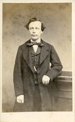 Studioporträt eines schmalen Herren in dunklen Mantel und Weste. Er lehnt sich mit dem linken Unterarm an eine, hinter ihm stehende Komode und blickt leicht am Betrachter links vorbei. Er hat einen schütteren Schnurrbart und seine dunklen Haare sind links gescheitelt, nach Hinten und zur Seite gekämmt. Auf der Rückseite: Gerschel Freres Photographes Rue de la Mesange N.3 Meisengasse N.3 Strasbourg