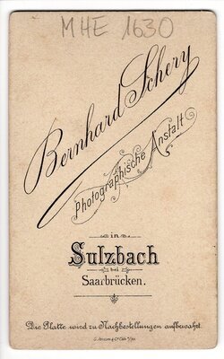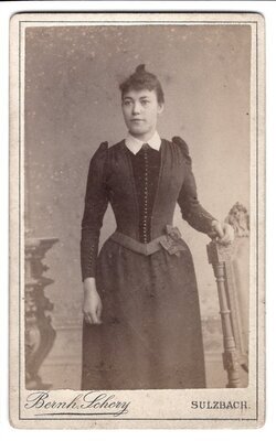 Das Mädchen hat die linke Hand auf einer Stuhlehne liegen. Ihr freundlich-ernster Blick geht an der Kamera vorbei. Sie trägt ein dunkles, langes Kleid mit Knopfleiste und einem, mit großer Schleife verziertem, Gürtel. Das Oberteil ziert ein weißer Kragen und leichte Puffärmel. Die Haare sind am Oberkopf zu einem kleinen Dutt zusammen gebunden. Auf der Vorder-und Rückseite des Kartons, ist die Eigenwerdung mit Logo der photographischen Anstalt Bernhard Schery aus Sulzbach aufgedruckt. Zusätzlich findet sich auf der Rückseite der Hinweis, dass die Platte für Nachbestellungen aufbewahrt wird.