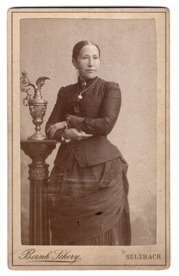 Die Frau steht angelehnt an einer Art Blumensäule, auf der eine verzierte Vase steht. Sie hat die Arme verschränkt und blickt, mit einem ersten Gesichtsausdruck, an der Kamera vorbei. Sie trägt ein nach unten ausladenes dunkles Kleid mit kleinem Stehkragen u heller Spitze an den Ärmeln. An der linken Hand trägt sie einen Ring. Eine Halskette, eine Brosche am Stehkragen und kleine Ohrringe sind weitere Schmuckstücke die seie trägt. Ihr Haar ist streng in der Mitte gescheitelt und vermutlich hinten zu einem Dutt zusammen gesteckt. Auf der Vorder-und Rückseite des Kartons, ist die Eigenwerdung, mit Logo der photographischen Anstalt Bernhard Schery, aus Sulzbach, aufgedruckt. Zusätzlich findet sich auf der Rückseite der Hinweis, dass die Platte für Nachbestellungen aufbewahrt wird.