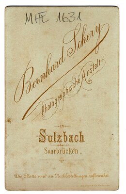 Die Frau steht angelehnt an einer Art Blumensäule, auf der eine verzierte Vase steht. Sie hat die Arme verschränkt und blickt, mit einem ersten Gesichtsausdruck, an der Kamera vorbei. Sie trägt ein nach unten ausladenes dunkles Kleid mit kleinem Stehkragen u heller Spitze an den Ärmeln. An der linken Hand trägt sie einen Ring. Eine Halskette, eine Brosche am Stehkragen und kleine Ohrringe sind weitere Schmuckstücke die seie trägt. Ihr Haar ist streng in der Mitte gescheitelt und vermutlich hinten zu einem Dutt zusammen gesteckt. Auf der Vorder-und Rückseite des Kartons, ist die Eigenwerdung, mit Logo der photographischen Anstalt Bernhard Schery, aus Sulzbach, aufgedruckt. Zusätzlich findet sich auf der Rückseite der Hinweis, dass die Platte für Nachbestellungen aufbewahrt wird.