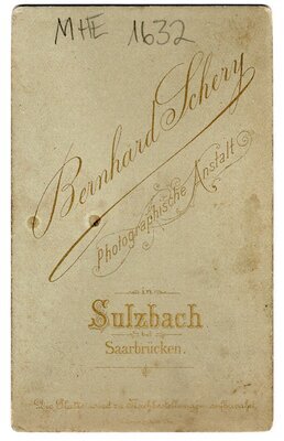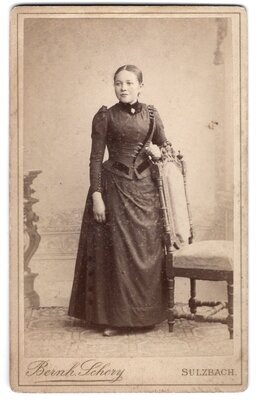 Das Foto zeigt eine vollständige Aufnahme einer jungen Dame, die an einem reich verzierten Polsterstuhl steht. Ihr linker Arm liegt auf der Rückenlehne. Ihr freundlicher Blick geht an der Kamera vorbei. Sie trägt ein 2-teiliges dunkles Kleid mt weitem Rock, der an einer Seite mit Knöpfen verziert ist. Das Oberteil ist eng anliegend, und hat in Taillenhöhe einen dunklen, taschenartigen Besatz. Der Stehkragen ist mit einer großer Brosche verziert. Ihre Haare sind streng in der Mitte gescheitelt und zusammengesteckt. Auf der Vorder-und Rückseite des Kartons, ist die Eigenwerdung mit Logo der photographischen Anstalt Bernhard Schery aus Sulzbach aufgedruckt. Zusätzlich findet sich auf der Rückseite der Hinweis, dass die Platte für Nachbestellungen aufbewahrt wird.