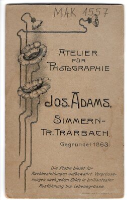Die Frau sitzt auf einem Stuhl neben einem Tisch. Auf ihrem rechten Bein sitzt ein Kleinkind, an ihrer linken Seite steht ein etwa 5 jähriges Mädchen. Die Frau trägt einen dunklen, langen Rock und eine gestreifte Bluse mit langen Ärmeln, Knopfleiste und Stehkragen. Sie trägt eine Hochsteckfrisur sowie Ohrringe und einen Ring an der rechten Hand. Das Kleinkind trägt ein langes weißes Kleidchen mit langen Ärmeln und Spitzenkragen sowie dunkle Schuhe. Es hat glatte, dunkle, kurze Haare und schaut interessiert in die Kamera. Das etwa 5 jährige Mädchen trägt ein kurzes weißes Kleid mit Bindegürtel, 3/4 langen Armen und einem großen Spitzenkragen. Es hat halblange dunkle Haare mit einer weiße Schleife. Alle drei schauen in die Kamera. Auf der Vorder-und Rückseite des Kartons, ist die Eigenwerdung, mit Logo des Ateliers Jos. Adams aus Simmern und Tr. Trarbach, aufgedruckt. Zusätzlich findet sich auf der Rückseite der Hinweis, dass die Platte für Nachbestellungen aufbewahrt wird.