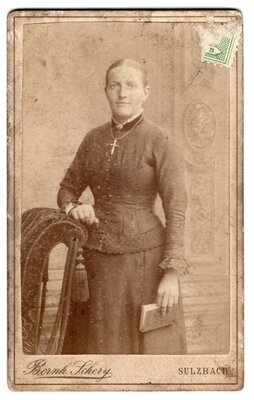 Die Aufnahme enstand in einem Fotostudio. Der Hintergrund, ist mit Stuckornamenten bemalt/verziert ist. Die abgebildete Frau schaut mit einem offenen, freundlich Blick direkt in die Kamera. Sie steht neben einem großen Polsterstuhl, dessen Rücklehne eine große Quaste ziert. Sie hat den rechten Arm auf die Stuhllehne gelegt, in ihrer linken Hand hält sie ein Buch, wobei der Zeigefinger als Art Lesezeichen zwischen den Seiten steckt. Bekleidet ist die Dame mit einem dunklen 2-teiligem Kleid. Das Oberteil ist tailliert geschnitten, mit durchgehender Knopfleiste, kleinem Stehkragen und Spitzenbesatz am Saum und Ärmeln. Sie trägt eine lange Kette mit einem großen Kreuz und eine Brosche am Kragen. Ihre Haare sind sehr streng mit Mittelscheitel zurück gekämmt. Auf der Vorder-und Rückseite des Kartons, ist die Eigenwerbung, mit Logo des photographischen Ateliers Bernhard Schery aus Sulzbach bei Saarbrücken aufgedruckt. Zusätzlich findet sich auf der Rückseite der Hinweis, dass die Platte für Nachbestellungen aufbewahrt wird.