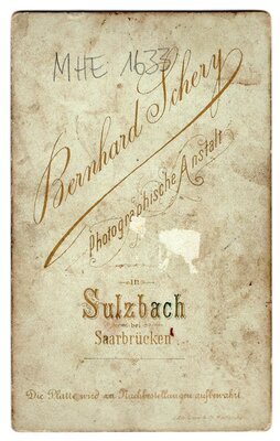 Die Aufnahme enstand in einem Fotostudio. Der Hintergrund, ist mit Stuckornamenten bemalt/verziert ist. Die abgebildete Frau schaut mit einem offenen, freundlich Blick direkt in die Kamera. Sie steht neben einem großen Polsterstuhl, dessen Rücklehne eine große Quaste ziert. Sie hat den rechten Arm auf die Stuhllehne gelegt, in ihrer linken Hand hält sie ein Buch, wobei der Zeigefinger als Art Lesezeichen zwischen den Seiten steckt. Bekleidet ist die Dame mit einem dunklen 2-teiligem Kleid. Das Oberteil ist tailliert geschnitten, mit durchgehender Knopfleiste, kleinem Stehkragen und Spitzenbesatz am Saum und Ärmeln. Sie trägt eine lange Kette mit einem großen Kreuz und eine Brosche am Kragen. Ihre Haare sind sehr streng mit Mittelscheitel zurück gekämmt. Auf der Vorder-und Rückseite des Kartons, ist die Eigenwerbung, mit Logo des photographischen Ateliers Bernhard Schery aus Sulzbach bei Saarbrücken aufgedruckt. Zusätzlich findet sich auf der Rückseite der Hinweis, dass die Platte für Nachbestellungen aufbewahrt wird.