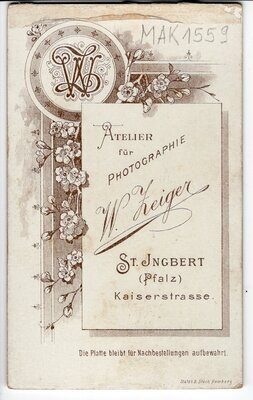 Die Vignettenaufnahme zeigt eine junge Frau in einem schwarzem Oberteil mit Stehkragen und Puffärmeln. Die Dame trägt eine Brosche und Ohrringe , ihr ernster lick zeigt nach rechts. Die Haare sind in der Mitte gescheitelt, nach hinten gekämmt und hochgesteckt. Auf der Vorder-und Rückseite des Kartons, ist die Eigenwerbung, mit Logo des Atelier W. Zeiger aus St. Ingbert, aufgedruckt. Zusätzlich findet sich auf der mit Blumenornamenten reichlich geschmückten Rückseite noch der Hinweis, dass die Platte für Nachbestellungen aufbewahrt wird.